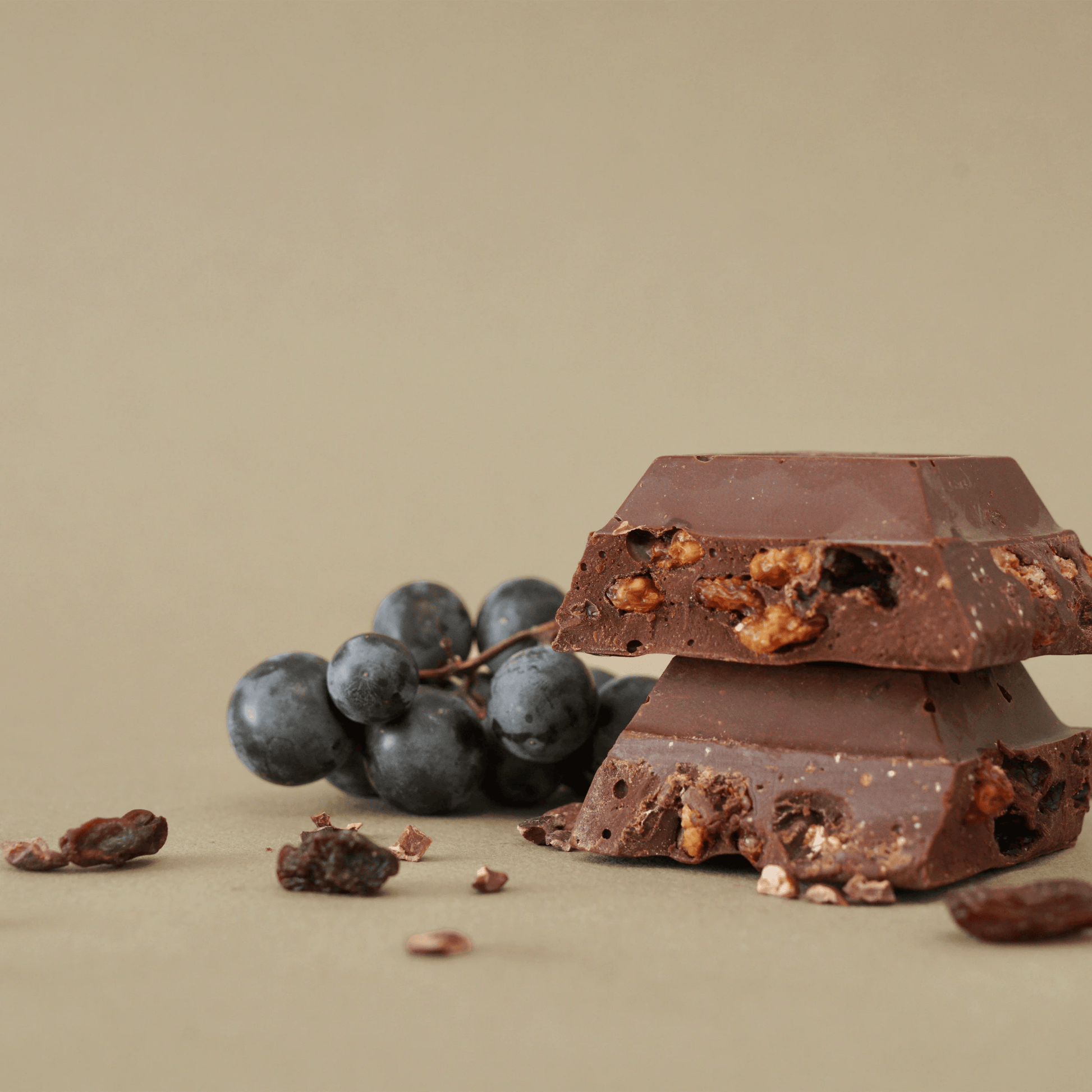 Após cerca de dois meses de maceração, as passas são escorridas e delicadamente misturadas com o nosso chocolate 70%.