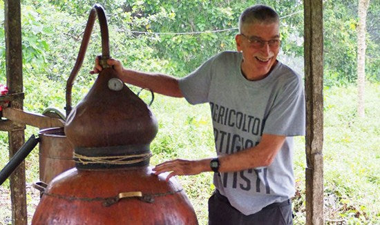 Destilamos a polpa de cacau diretamente na plantação e neste destilado, puro como vem do alambique, maceramos as passas.